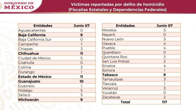 En el reporte diario, se expone que ese día se registraron 117 homicidios dolosos.
