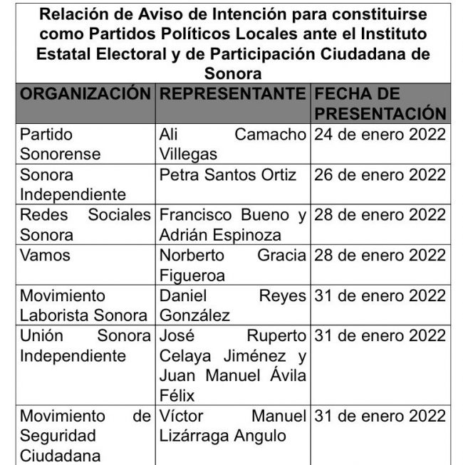 Mientras tanto, en donde han desahogado tupida agenda de trabajo es en el Instituto Estatal Electoral de Sonora, ya que luego de determinar los montos de financiamiento para partidos políticos en este 2022, el consejo general presidido por Nery Ruiz Arvizu recibió las cartas de intención de representantes de siete organizaciones que pretenden constituirse como partidos políticos locales.