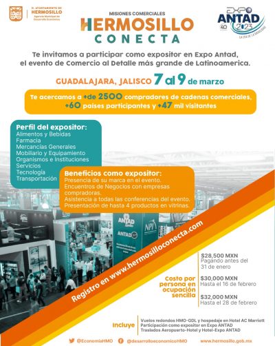 Hermosillo, Sonora; 10 de enero, 2023.- Empresas de la ciudad están invitadas a la misión comercial del programa Hermosillo Conecta de la Agencia Municipal de Desarrollo Económico (AMDE), para participar en la Expo ANTAD, el evento de comercio al detalle más grande de Latinoamérica en Guadalajara, Jalisco.