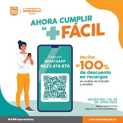 Hermosillo, Sonora; 27 de junio, 2023.- La directora de Ingresos de la Tesorería Municipal de Hermosillo, Yazmina Anaya Camargo recordó que contribuyentes tienen hasta este viernes 30 de junio para aprovechar la gran promoción del 100 por ciento de descuento en recargos de predial y multas de tránsito, al pagar por medio de WhatsApp y del portal de internet.