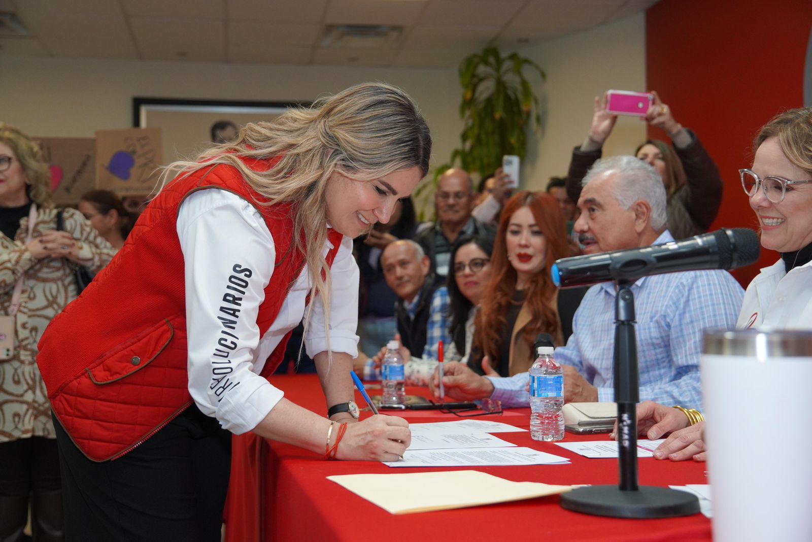 Acompañando a Lupita Soto para su registro, su padre el huatabampense Heliodoro Soto; en primera fila el binomio que dirige al PRI en Hermosillo, Luis Miguel Vargas y Blanca Colosio, eventuales cartitas para las diputaciones locales con cabecera en Hermosillo.