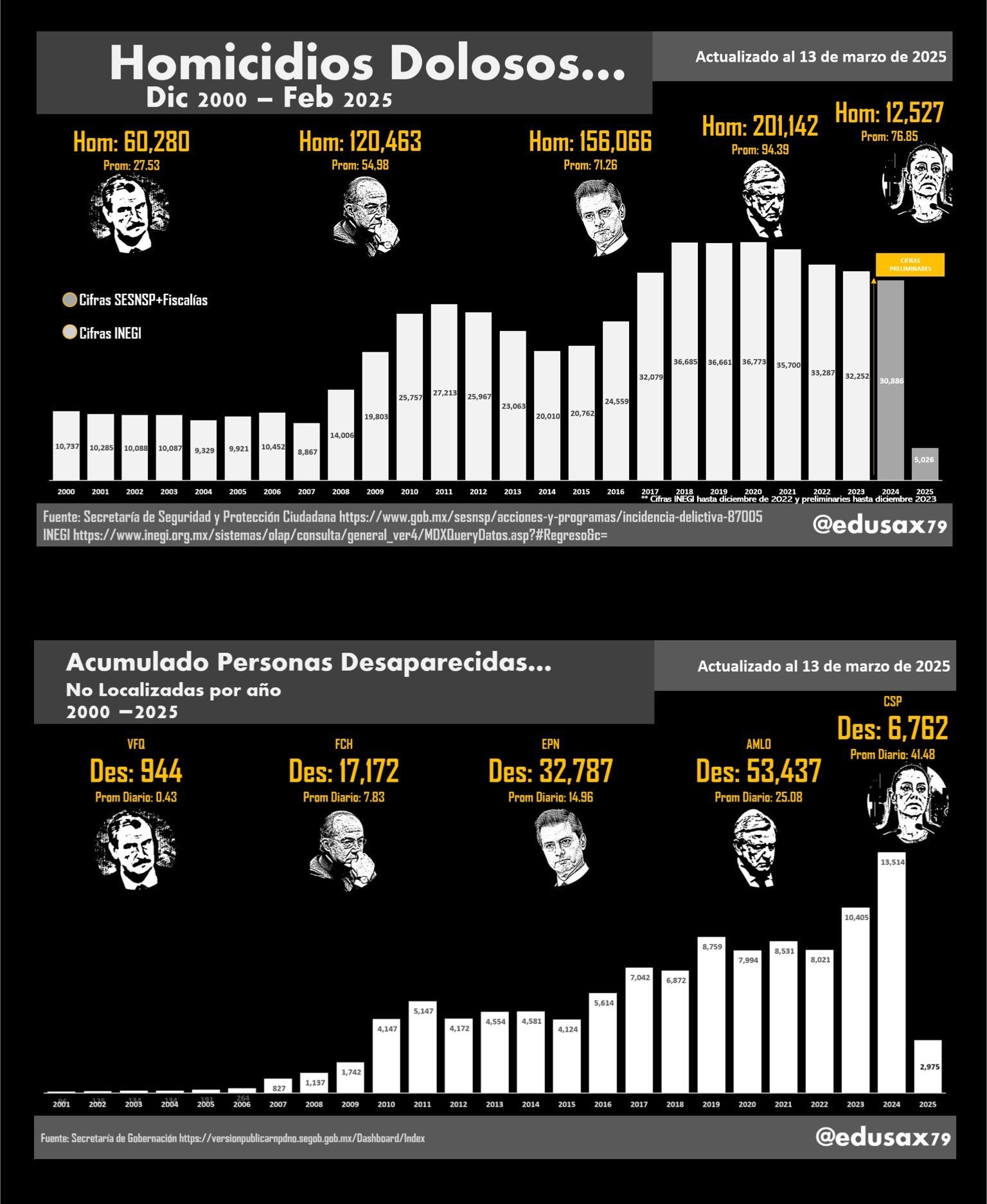 Y no dejan mentir las mismas estadísticas actualizadas al 13 de este mes de la Secretaria de Seguridad Pública federal, que coloca a la gestión presidencial con un promedio de casi 77 homicidios dolosos diarios y contando, así como también casi 42 desapariciones diarias, muy por encima de su antecesor, perfilándose la continuación del baño de sangre.