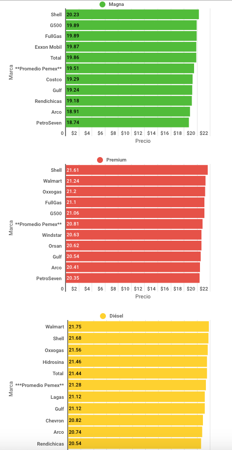A continuación, te presentamos el listado de las marcas y los costos que la Sener registró entre los días 6 y 12 de abril en los combustibles.
