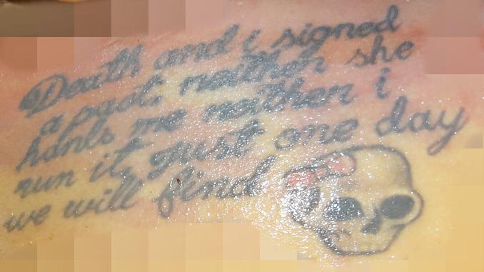 Tiene números romanos la parte interna del antebrazo derecho, cerca de la mano, además de una leyenda en inglés en la espalda derecha con un dibujo de un cráneo con moño rojo, y un brazalete tribal en el tobillo derecho.