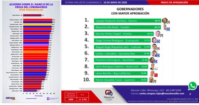 Por lo demás, no podía ser de otra forma, porque como era de esperarse, en las últimas encuestas de México Elije y Massive Caller, la gobernadora Claudia Pavlovich ocupa el primer lugar a nivel nacional sobre el buen manejo y gestión ante la crisis sanitaria por la pandemia del Covid-19 al ser aprobada por el 84.9 de los entrevistados, dejando muy atrás por ejemplo a López Obrador que resultó reprobado con una calificación de apenas 52.5, en tanto en términos generales, la mandataria sonorense también aparece a la cabeza con una calificación de 68.4.
