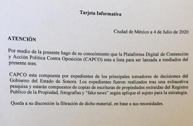 En una circular filtrada, se avisa que la Plataforma Digital de Contención y Acción Política Contra Oposición ya está lista y ponen a disposición de maquiavelitos de pacotilla, expedientes sobre propiedades y fotografías y “fake news» según aplique el sujeto para la estrategia. Queda a su discreción la filtración de dicho material en base a sus necesidades”, dice el panfletito.