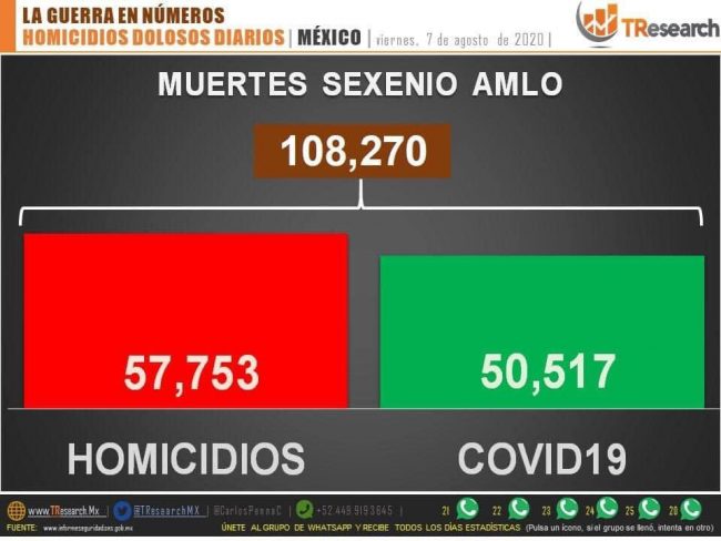 Miren, sumando las víctimas del Covid-19 y los homicidios dolosos, son más de 110 mil muertos desde el 1 de diciembre del 2018, y contando, mientras que en materia económica, y antes de la crisis sanitaria, ya el decremento superaba el -1 uno por ciento y actualmente la tendencia es que para fines de año andaremos en un desplome del hasta el -8 por ciento.