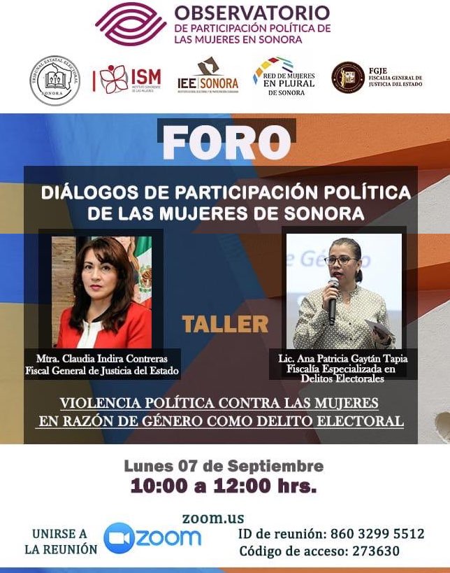 La cita es a las diez de la mañana, con ponentes como la Fiscal General de Justicia de la entidad, Claudia Indira Contreras y Ana María Gaytán Tapia, de la fiscalía en materia de delitos electorales, con la participación del organismo ciudadano Sonora Observa; el IEES; la Red de Mujeres En Plural, y el Instituto Sonorense de la Mujer.