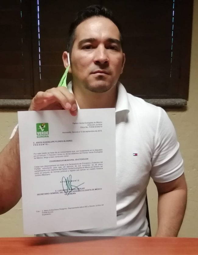 Y duro y a la cabeza se lanzó Jesús Flores Alvares al renunciar a la dirigencia del Partido Verde en el municipio de Etchojoa, en respuesta a lo que dijo son decisiones tomadas por ese partido a nivel local como estatal y que a pesar de tanto trabajo desplegado no se les toma en cuenta ni se les ha proporcionado ningún apoyo de la dirigencia estatal.