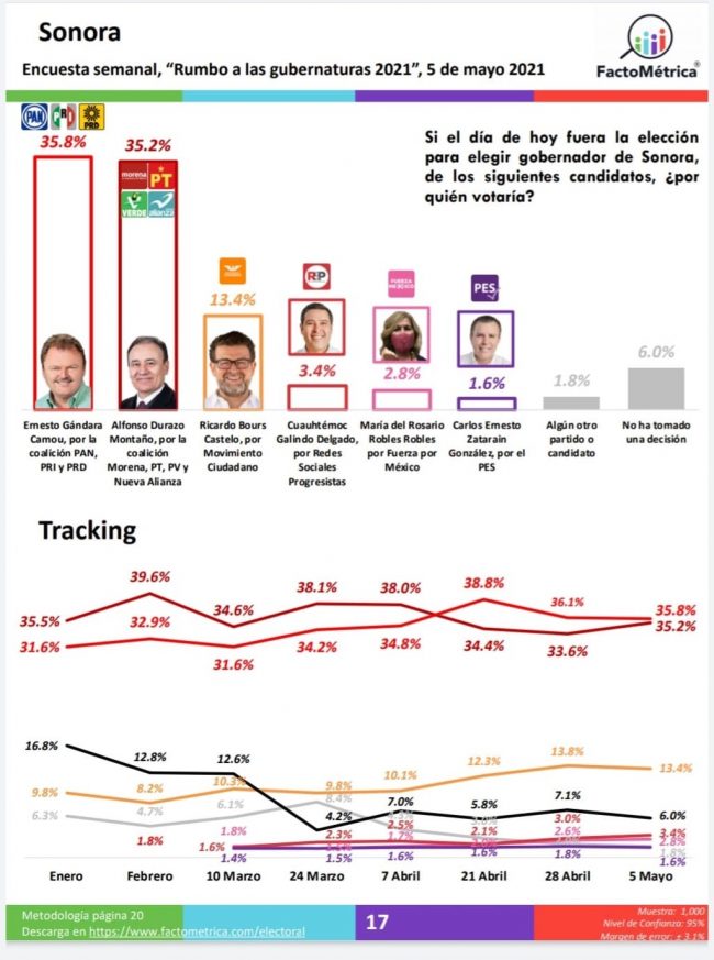 Y ya son varias encuestas de distintas empresas que dejan en el terreno de lo indubitable la tendencia que favorece a la Alianza Va Por Sonora, como es el caso del levantamiento de Factométrica dado a conocer este miércoles, donde se ratifica que Gándara Camou ya rebasó al enviado de Palacio Nacional y que el de cabello ensortijado luce incontenible con miras a ganar la gubernatura con al menos 8 puntos de ventaja.
