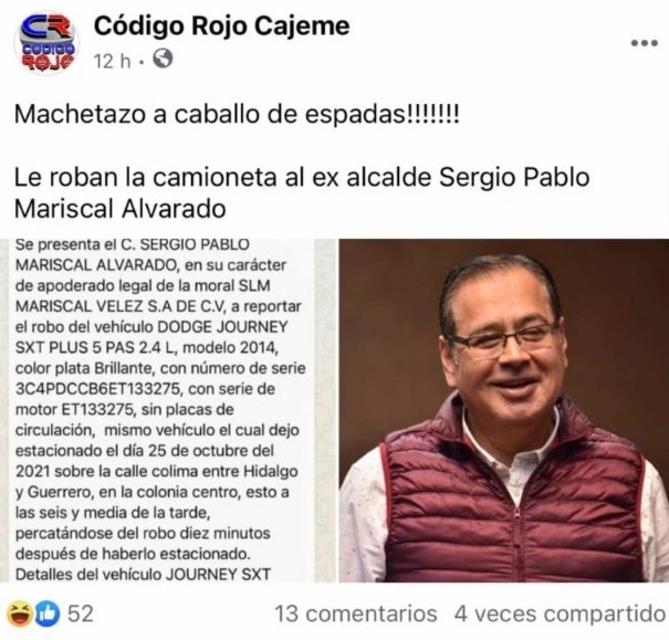 Pues resulta que según denuncia en parte policiaco, al exmunícipe cajemense le robaron su vehículo en un dos por tres al dejarlo debidamente estacionado en una concurrida vialidad de esa balaceada comunidad, aunque hay quienes aseguran que tal unidad motriz no fue robada, si no que al presunto perjudicado se le olvidó donde la estacionó, toda vez el estado pedo en que andaba.
