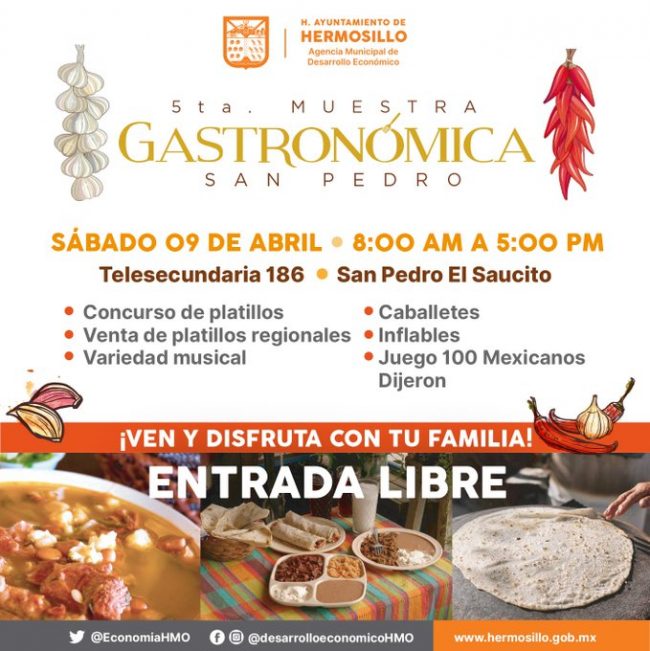 Mientras tanto, en exquisito anuncio, el sábado 9 de abril se lleva a cabo la quinta muestra gastronómica en San Pedro o sea, no se pueden perder disfrutar la rica oferta de manjares culinarios en las instalaciones de la Telesecundaria 186 a partir de las ocho de la mañana, cuando la rifaran el pozole, menudo, cocido, gallina pinta, burritos de carne con chile, de machaca, de frijolitos, de asada, dulces regionales y mucho más.