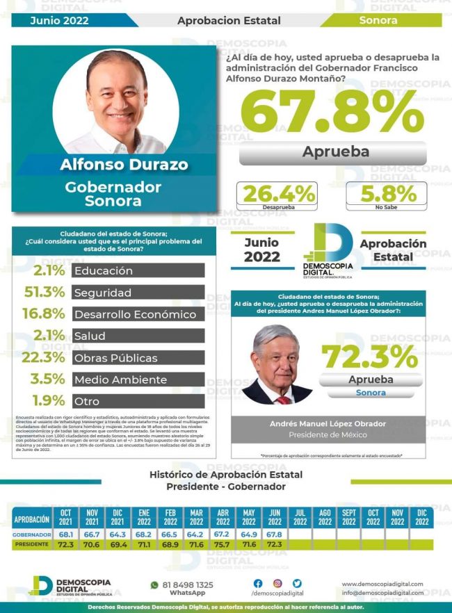No nos extraña para nada el alto posicionamiento que mantiene el gobernador Durazo con ese 67.8 de aprobación, bono democrático que podría incrementarse conforme se vean con mayor claridad y certeza todas esas magnas obras que ha anunciado, además de su positivo protagonismo e interacción con todos los sectores de la sociedad sonorense.
