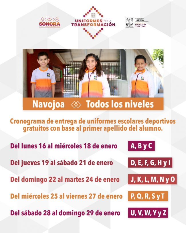 Por otra parte, en Navojoa la entrega continuará para todos los niveles educativos del 16 al 29 de enero, comenzando el lunes 16 con las primeras letras del abecedario, para así reducir filas, evitar aglomeraciones y que la entrega de los paquetes se lleve a cabo con fluidez.