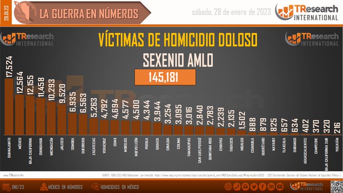 Más allá de lecturas e interpretaciones a las estadísticas del mismo gobierno, en México ya van 145 mil 181 homicidios dolosos durante la gestión de López Obrador, muchos más que a estas alturas del partido se habían perpetrado durante los gobiernos de Enrique Peña Nieto (92 mil 675); Felipe Calderón (71 mil 442), y Vicente Fox (41 mil 541).