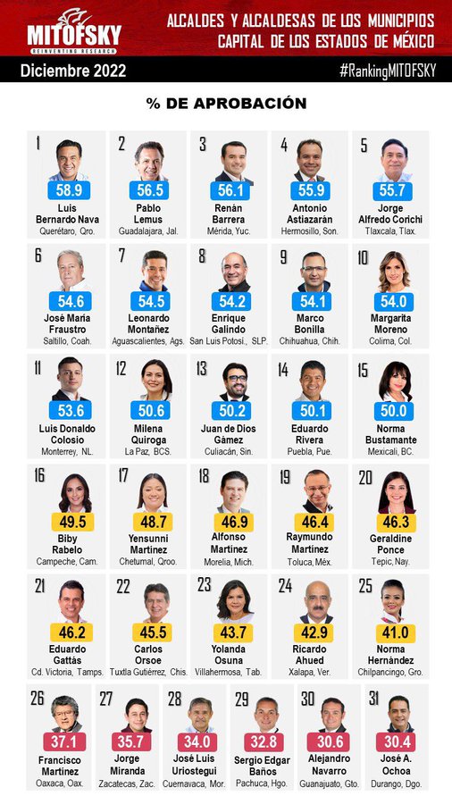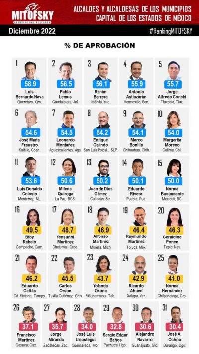Pero independientemente de tal perspectiva, valga destacar las campanas al vuelo del presidente municipal de Cajeme, Javier Lamarque Cano porque una de esas encuestadoras –Demoscopia Digital– lo coloca como el alcalde mejor calificado de Sonora, por encima del de Hermosillo, Antonio Astiazarán, quien la Mitofsky lo ubicó como el cuarto mejor calificado de los municipios capital de todo el país, con una aprobación del 55.9 por ciento, muy superior al 49.5 por ciento que le concede Demoscopia Digital y también muy superior al 50.5 por ciento que dicha empresa asigna a Lamarque.