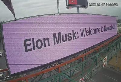 Para el 17 de diciembre pasado, gigantescos espectaculares digitales e impresos inundaron la capital neolonesa y municipios conurbados, dando la bienvenida a la persona más rica del mundo, adelantándose que ya todo estaba listo para anunciar que Tesla instalaría una planta de ensamblaje de vehículos eléctricos en la zona industrial de Santa Catarina y que incluso ya se había concretado la compra de mil 600 hectáreas.