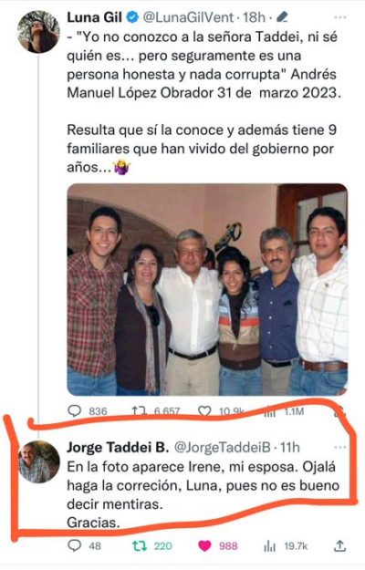 Por mero oficio este reportero intentó aclarar a connotados tuiteros y periodistas de las ligas mayores que divulgaron como cierta, que la dama retratada junto a la hija e hijos de Jorge acompañados de López Obrador no era Lupita, si no la esposa de delegado del Bienestar en Sonora, pero en fin.