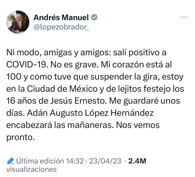 Lo inquietante es esa operación limpieza en redes de donde de pronto desaparecieron posteos que aluden ese soponcio y luego la versión oficial desmiente al desmentido de Ramírez Cuevas y confirma la suspensión de la gira, con un tuitazo del mismo presidente o de su community manager donde informa que por tercera ocasión ha sido infectado por el Covid-19 y que por esa razón acompañará a su hijo menor, Jesús Ernesto, en su cumpleaños 16 y que como estará aislado será el titular de la SEGOB quien se haga cargo de las mañaneras mientras duran sus dolencias.