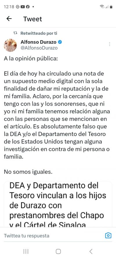 Mientras tanto, firme y categórica la respuesta del gobernador Alfonso Durazo Montaño a la versión divulgada en un medio digital sobre presuntas indagatorias por agencias del gobierno de Estados Unidos contra su familia, por supuestos vínculos con lavado de dinero y el narcotráfico.