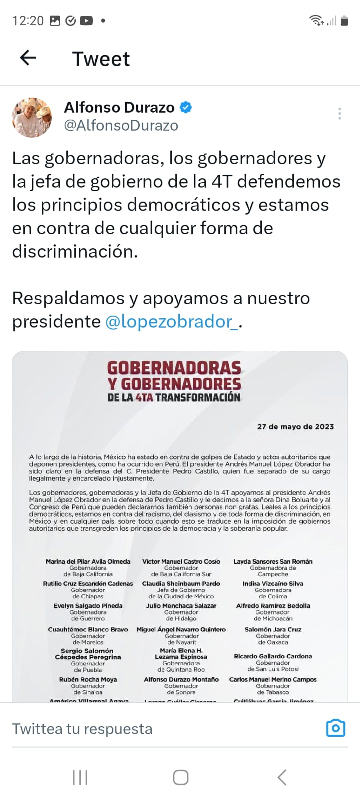 Pues nuestro mandatario estatal transitó de lo sublime a lo ridículo, al firmar un panfleto en donde se suma junto al resto de las representaciones de MORENA en gobiernos estatales, a la histórica intromisión del presidente de México en asuntos que solo le competen el pueblo de Perú, escalada de confrontación que constituye de facto el desconocimiento de la vigencia de la Doctrina Estrada.