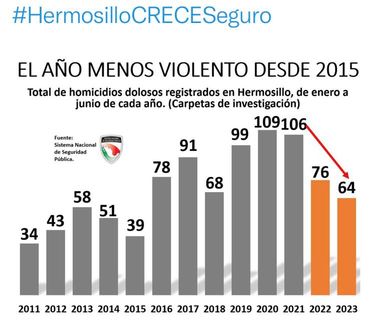 Mientras tanto, el presidente municipal de Hermosillo, Antonio Astiazarán Gutiérrez hace bien en cacaraquear el huevo para que no pase desapercibido el que, de acuerdo con cifras del Secretariado Ejecutivo del Sistema Nacional de Seguridad Pública, en el primer semestre del 2023 se registró en el municipio capitalino el menor número de homicidios dolosos desde el 2015.