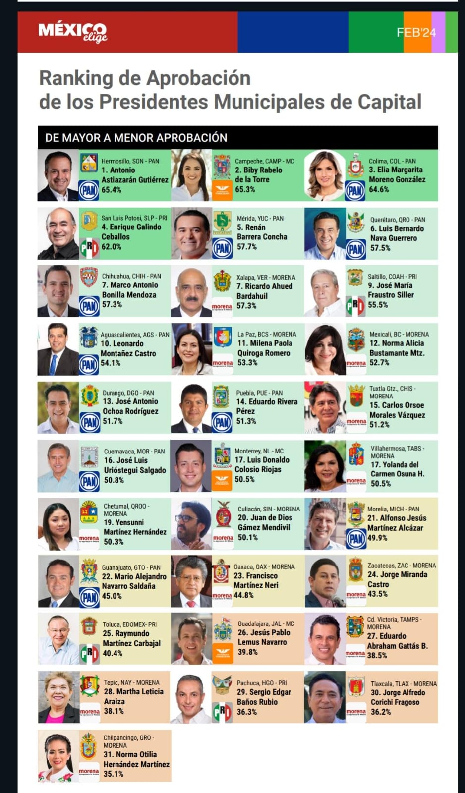 En el estudio de opinión pública que dio a conocer México Elige este 11 de febrero de 2024 se especifica el caso de 31 presidentes municipales de capitales de estado en el país, donde Toño Astiazarán resaltó como el mejor evaluado por los habitantes de su municipio, seguido de la alcaldesa de Campeche, Biby Rabelo de la Torre, Elia Margarita Moreno González, de Colima y Enrique Galindo Ceballos de San Luis Potosí.