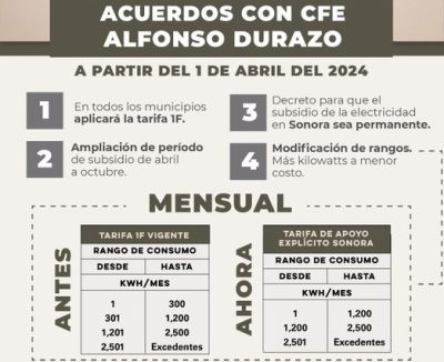 De acuerdo con lo dado a conocer, la tarifa subsidiada se adelanta un mes y será a partir del 1 de abril y se extenderá hasta el último día de octubre, con “tarifas blandas” hasta dos mil 500 kilowatts hora al mes y lo más importante, eliminando el rango de 1 a 300 kilo watt hora al mes y llevarlo a 1 a mil 200 kilo watt hora al mes, que deberá cubrir de beneficios a clases medias y populares.