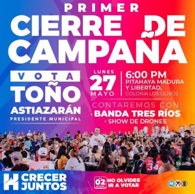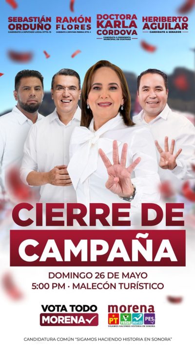 A propósito de cierres de campaña, fuimos convocados, pero por asuntos de familia no pudimos ir al de la ya citada Karla Córdova, quien a partir de las cinco de la tarde de este domingo echará la casa por la ventana en el Malecón Turístico, acompañada por Sebastián Orduño, candidato a diputado local; Ramón Flores, aspirante a diputado federal y Heriberto Aguilar, segundo de a bordo de la fórmula al senado encabezada por Lorenia Valles.