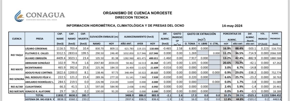 El problema es mayúsculo y los pronósticos peores: es generalizada la opinión de expertos en materia climática respecto a que la falta de lluvias este año será peor que en la temporada de aguas del año pasado, cuando el almacenamiento de las presas sonorenses se encuentra al nivel más bajo desde que se realizan esas mediciones, con un acumulado de solo el 10.2 por ciento de agua almacenada, comparado al almacenamiento de casi el 40 por ciento este mismo día de mayo el año pasado.