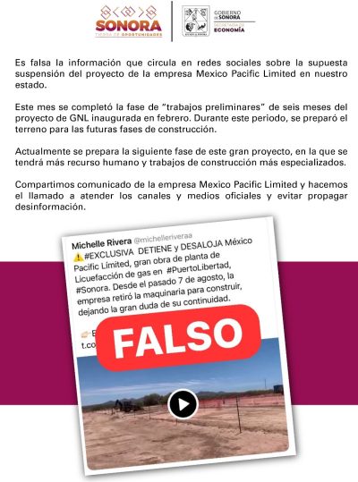 A propósito, luego de varios días de correrse la versión de la suspensión de las obras para la instalación de la planta de licuefacción de gas natural en Puerto Libertad, por fin se hizo la aclaración correspondiente de parte de la secretaría de Economía, porque no hay tal, sino que se trata del traslape de una etapa a otra en el proceso de construcción de dicha infraestructura que ejecuta la empresa México Pacífic LTD.