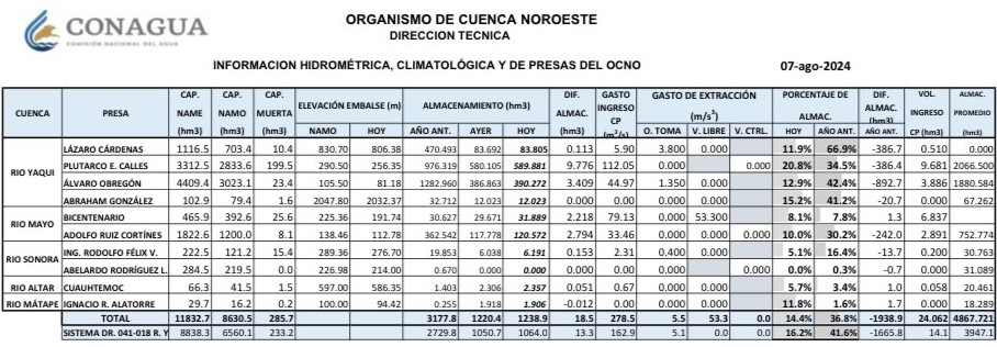 El panorama de las presas es desolador: solo contienen el 14.4 por ciento de su capacidad de almacenaje, con casi mil 940 millones de metros cúbicos menos que en estas fechas del 2023, y la cuenca más importante para efectos económicos y sociales, la del Río Yaqui, solo dispondrá de agua para consumo humano, descartándose los segundos cultivos en el Sur de Sonora.