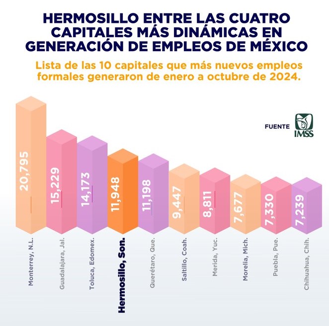Por supuesto que hay una confluencia de condiciones favorables recreadas también por la instancia estatal, pero el hecho es que Hermosillo se posiciona entre las cuatro capitales más dinámicas en generación de empleos a nivel nacional, al generarse en octubre pasado tres mil 732 nuevos empleos de acuerdo son datos del IMSS, para liderar al estado en ese rubro y ubicarse en el cuarto lugar de las capitales estatales con mayor dinamismo económico.