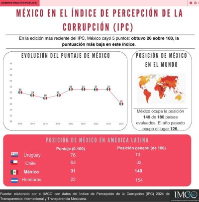 El hecho es que México cayó al puesto 140 tras dos años de estar en el 126 de 180 países evaluados en el Índice de Percepción de la Corrupción de 2024 que publicó este martes la organización Transparencia Internacional, que dio a la nación su calificación más baja en la historia, de 26 sobre 100.