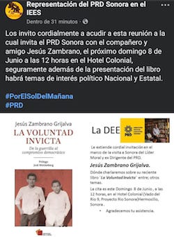 La cita es en uno de los salones del Hotel Colonial en el Vado del Río, con la aclaración de que no será una presentación literaria propiamente dicha, si no que es motivo de reunión de liderazgos y cuadros del PRD para platicar sobre el contenido de la obra y seguramente del proceso de reconstrucción de la organización representativa de la izquierda histórica de Sonora.