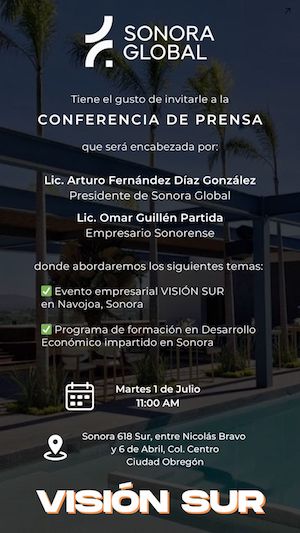 Mientras tanto, desde Ciudad Obregón nos llega la invitación a la conferencia de prensa que ofrecerá Arturo Fernández Díaz González, presidente de Sonora Global y el joven empresario y compa de este espacio, Omar Guillén Partida.